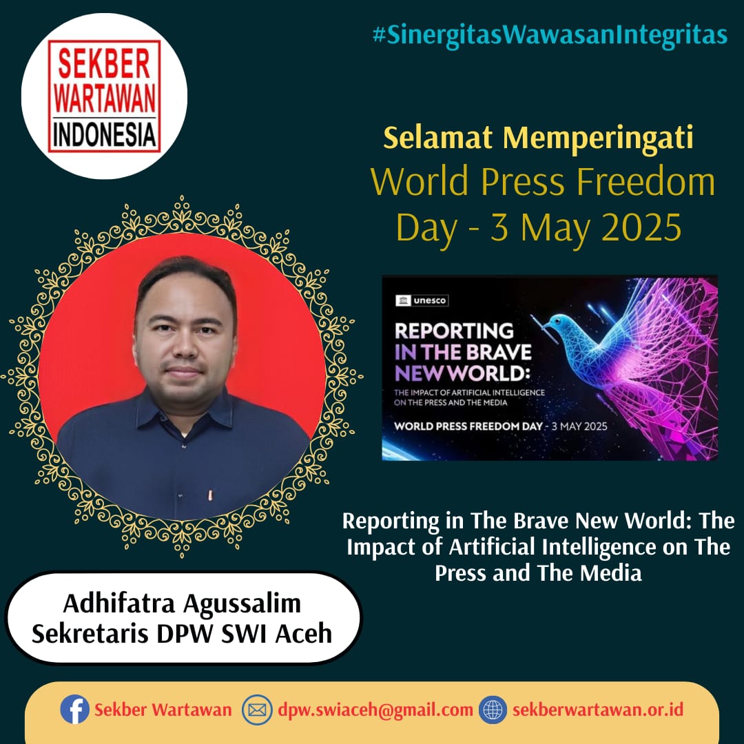 Peringatan Hari Kebebasan Pers Sedunia tahun ini mengambil tema Reporting in The Brave New World: The Impact of Artificial Intelligence on The Press and The Media, menjadi momentum refleksi bagi seluruh pelaku media baik online dan cetak di Aceh agar tetap menjunjung tinggi kebebasan pers yang bertanggung jawab serta memperkuat peran media sebagai pilar keempat demokrasi di tengah derasnya gelombang informasi digital.