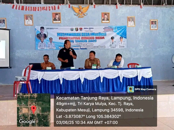 Bertempat di ruang rapat Kantor Desa Trikarya Mulya dilaksanakan kegiatan Musyawarah Desa dalam Penetapan Pemutakhiran Data Indeks Desa Tahun 2025. Rapat dipimpin oleh Kepala Desa Fathur Rohman, beserta perangkatnya, BPD, LPM, tokoh masyarakat, kader pemberdayaan, pendamping desa, serta perwakilan dari kelompok masyarakat lainnya seperti karang taruna, PKK, dan RT/RW. Senin (3/6/25)