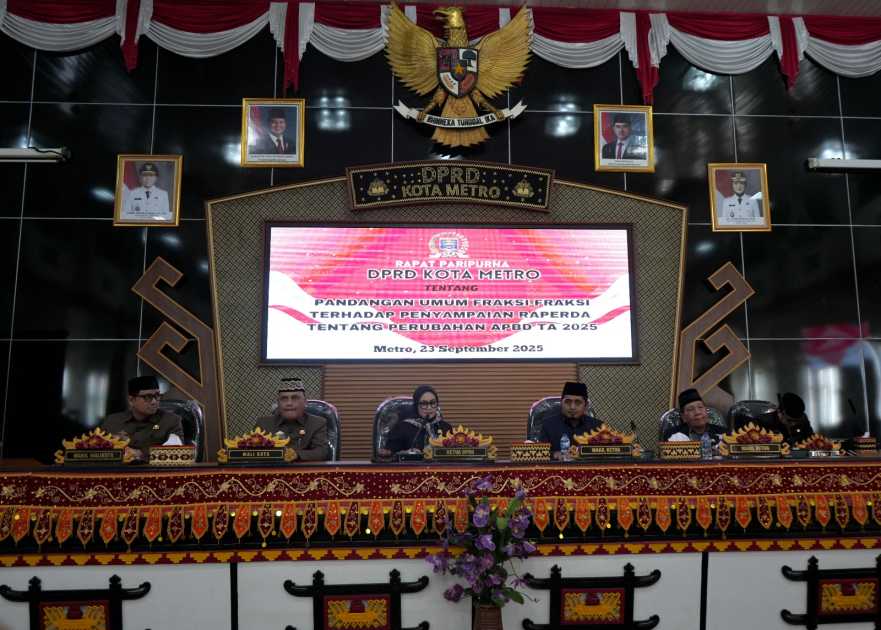 Dewan Perwakilan Rakyat Daerah (DPRD) Kota Metro menggelar Rapat Paripurna tentang pandangan umum fraksi-fraksi terhadap penyampaian Raperda Perubahan APBD Tahun Anggaran 2025.Selasa (23/09/2025).