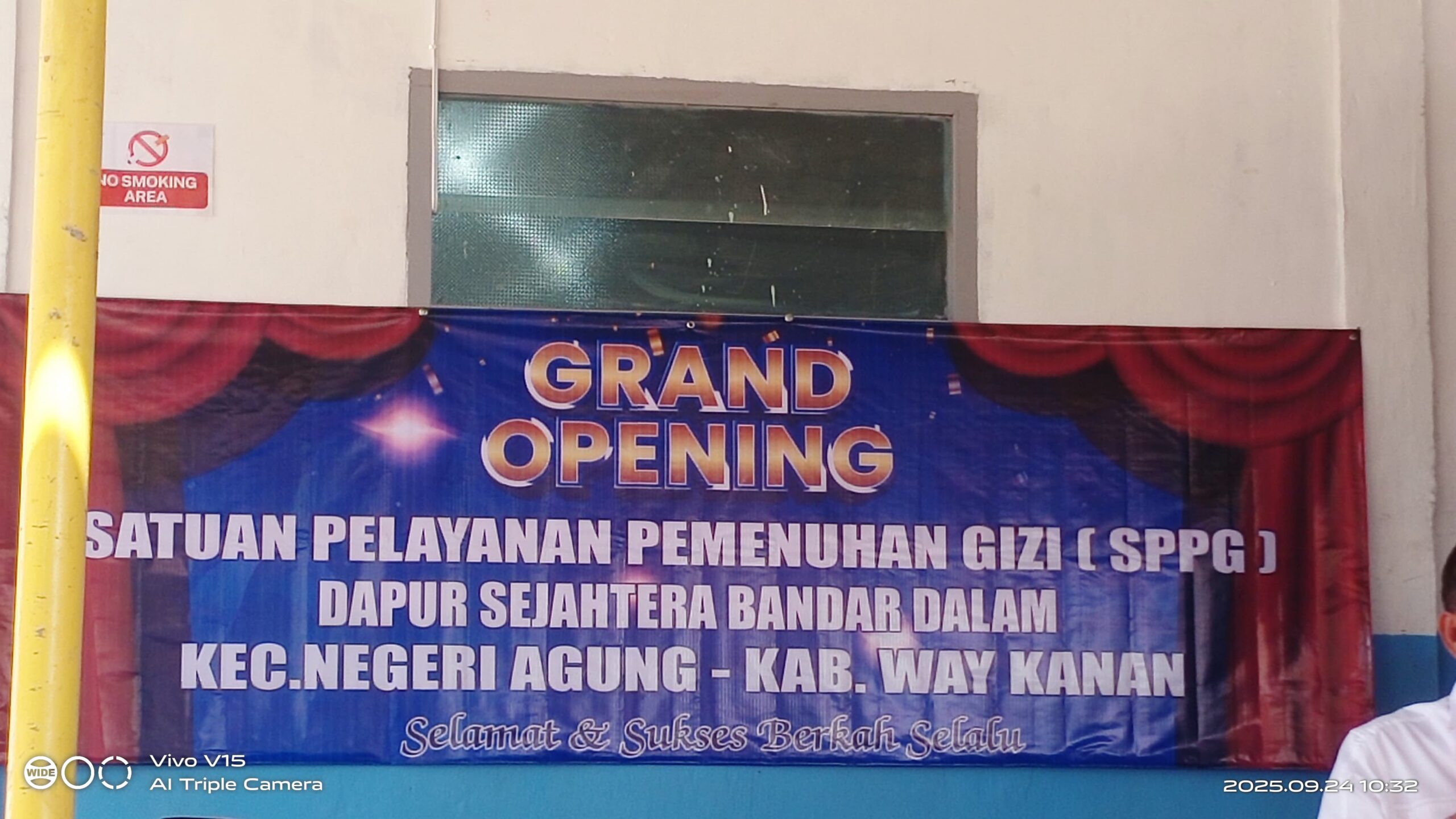 Pemerintah Kampung Bandar Dalam, Kecamatan Negeri Agung, resmi membuka Grand Opening Satuan Pelayanan Pemenuhan Gizi (SPPG) Dapur Sejahtera Kampung Bandar Dalam. Kegiatan ini dihadiri oleh Camat Negeri Agung, Bapak Hepi Haryanto S.E , Uspika Kecamatan Negeri Agung, Danramil Negeri Agung, dari pihak Kepolisian Sektor Negeri Agung, Kepala Sekolah dari tingkat PAUD hingga SMA, masyarakat, ormas, dan media lainnya.acara berlangsung di Kediaman Kepala Kampung Bandar Dalam,24/09/2025.