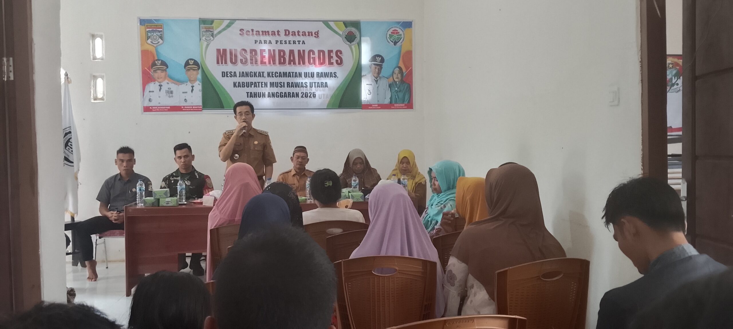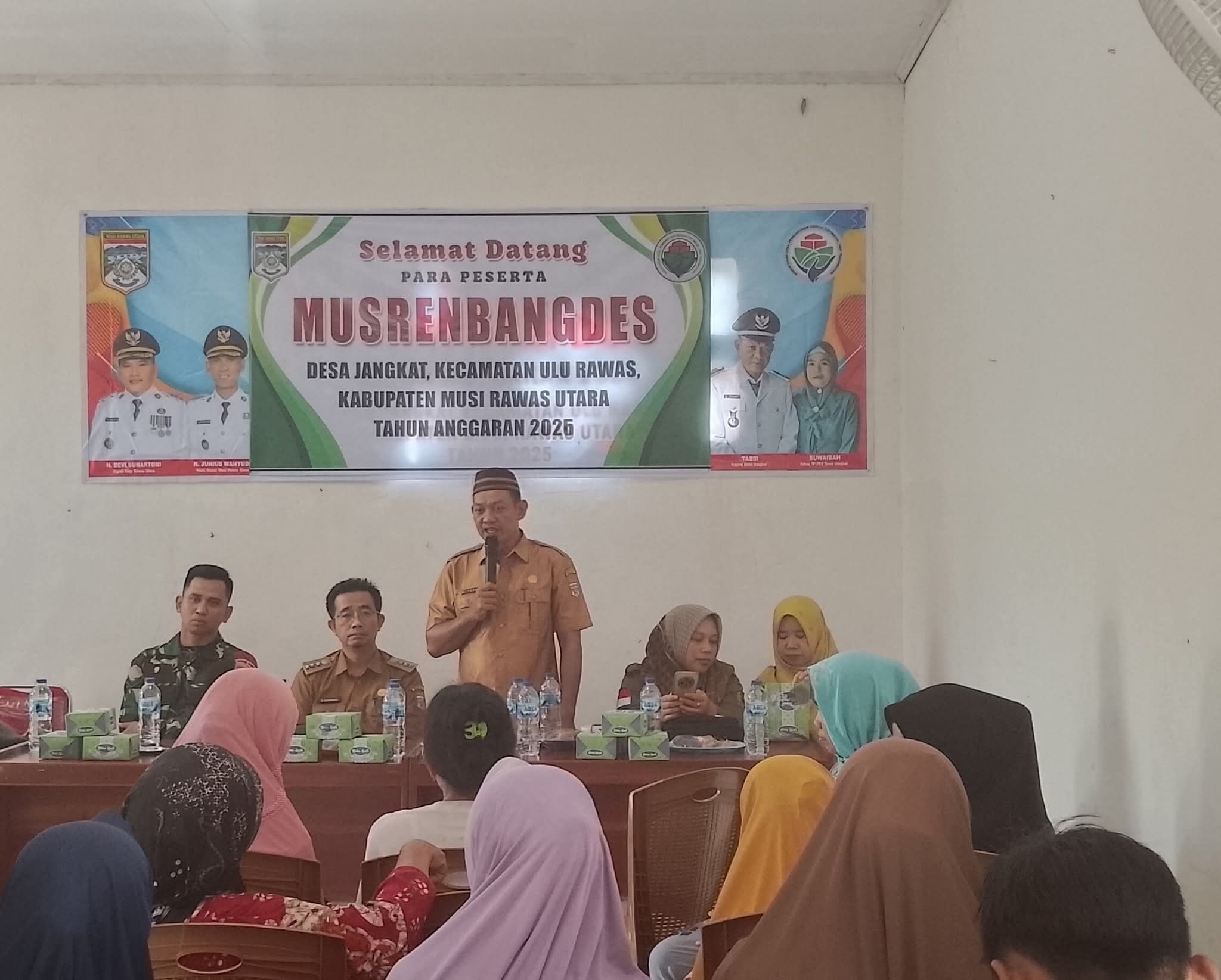 Pemerintah Desa (Pemdes) Jangkat, Kecamatan Ulu Rawas, Kabupaten Musi Rawas Utara (Muratara), Provinsi Sumatera Selatan, menggelar Musyawarah Perencanaan Pembangunan Desa (Musrenbangdes) Tahun 2026. Kegiatan ini berlangsung di Kantor Desa Jangkat pada Selasa (14/10/2025) pukul 14.27 WIB.