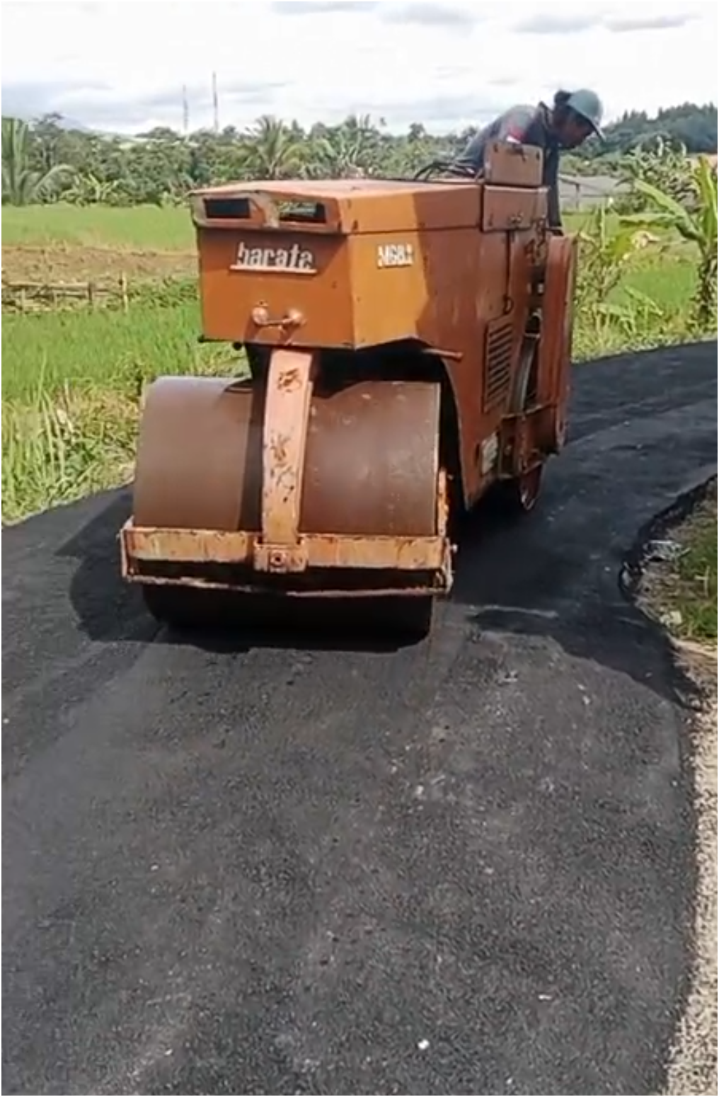 Di lapangan, para pekerja mulai melakukan penghamparan material aspal dan pemadatan menggunakan mesin roller. Meski alat berat yang digunakan tampak berusia cukup lama, proses pengerjaan tetap dilakukan bertahap untuk memastikan kualitas sesuai standar.