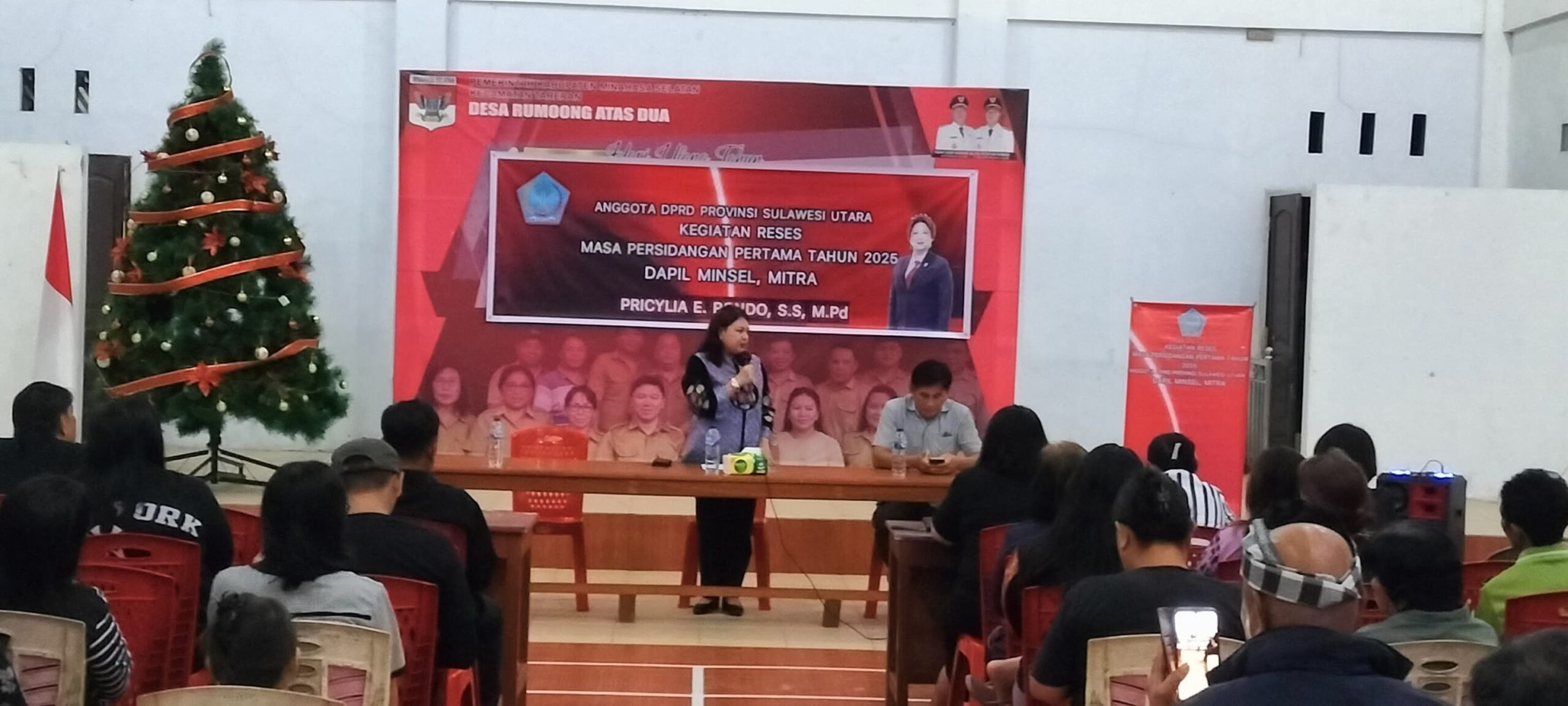 Minsel, FaktaBerita— Anggota Dewan Perwakilan Rakyat Daerah (DPRD) Provinsi Sulawesi Utara (Sulut) dari Komisi II, Priciliya Elviera Rondo, SS.MPd, menggelar kegiatan Reses Masa Persidangan Ketiga Tahun 2025 di Desa Rumoong Atas Dua, Kecamatan Tareran, Kabupaten Minahasa Selatan (Minsel), Sabtu (29/11/2025).