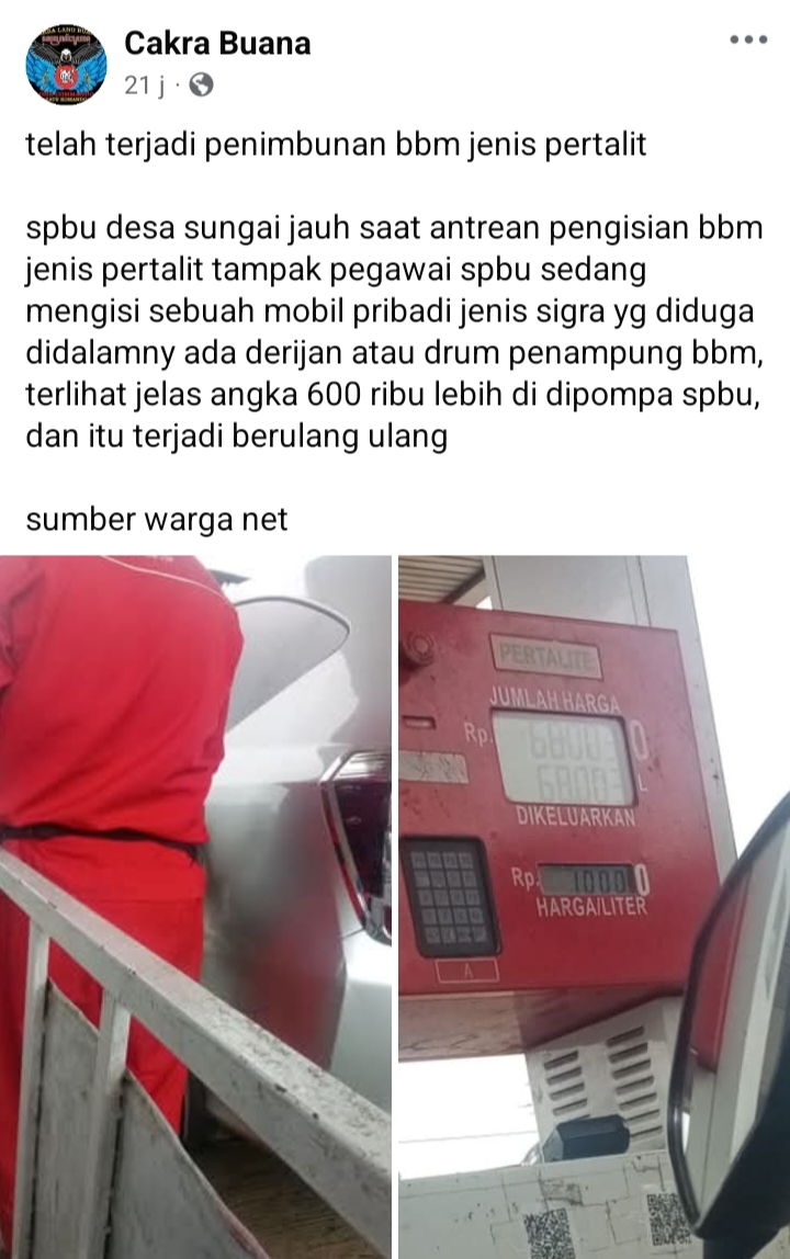 Informasi ini pertama kali muncul setelah akun Facebook Cakrabuana mengunggah foto yang memperlihatkan pegawai SPBU tengah mengisi BBM jenis Pertalite ke sebuah mobil pribadi jenis Sigra. Dalam foto tersebut, angka pada mesin dispenser menunjukkan jumlah pembelian mencapai lebih dari Rp600 ribu dalam satu kali pengisian. Aktivitas ini disebut terjadi berulang kali.dan didalam mobil tersebut menurut informasi,terdapat 2 dirijen bermuatan 35 liter.